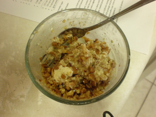Chop up the pecans fairly fine. Melt some margarine or butter in a pan and toss in chopped pecans just until you can start to smell them: about 5 minutes.