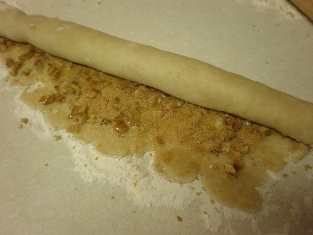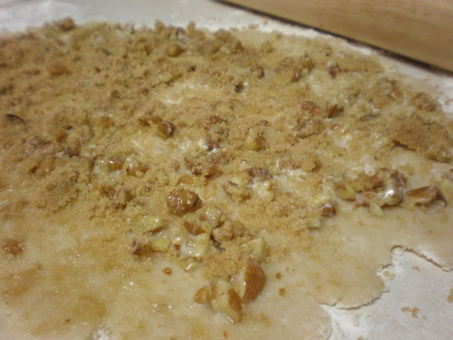 Roll out the rested dough and spread the pecan butter mixture over all of the dough. Make sure to get the edges. Sprinkle the brown sugar on top and roll it up.