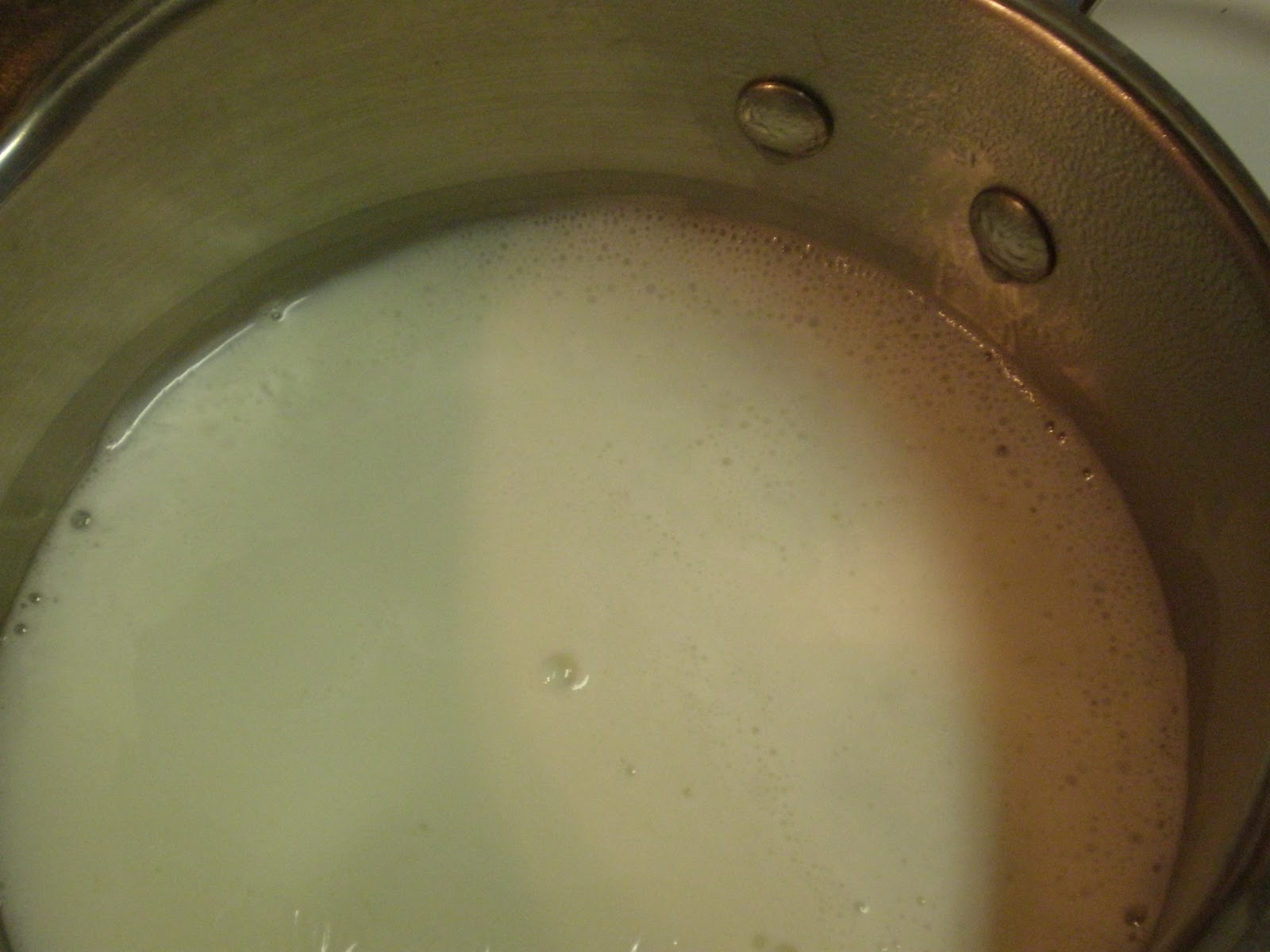 First thing we want to do is scald the milk. Heat the milk in a small pan stirring continuously until tiny bubbles start to appear around the edges. Once the bubbles appear take off heat immediately.