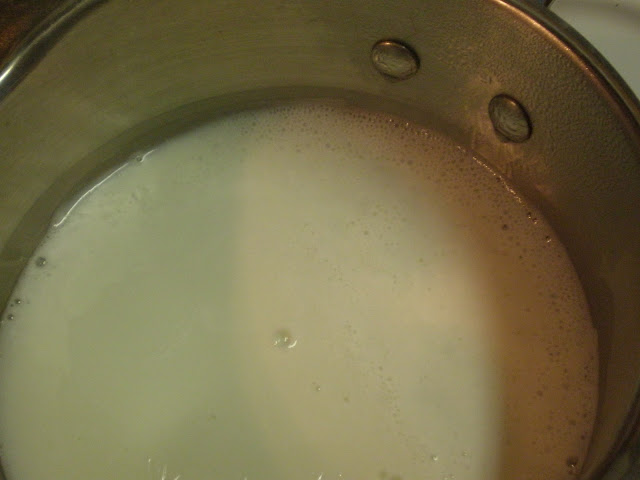 First thing we want to do is scald the milk. Heat the milk in a small pan stirring continuously until tiny bubbles start to appear around the edges. Once the bubbles appear take off heat immediately.