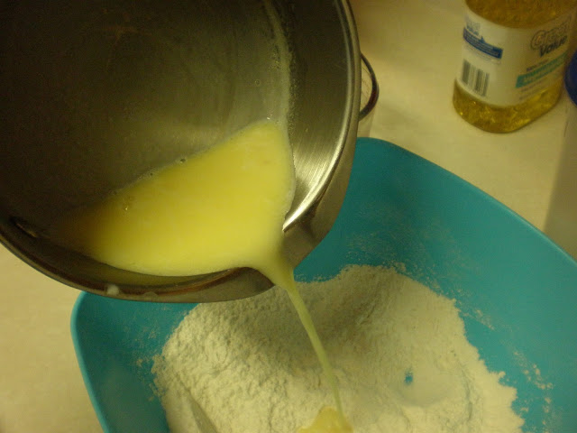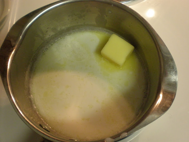 Once off the heat, melt the 2 TBS of butter in the milk stirring occasionally While letting the butter melt, in a separate bowl mix together 1 cup flour, yeast, sugar, and salt with a fork.