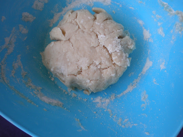 Add the other 1/2 cup of flour mix in, and just when the dough starts to come together toss it onto a lightly floured surface. Knead for about 3 min, just until the dough begins to form one big piece. If its a little dry add a bit of water.